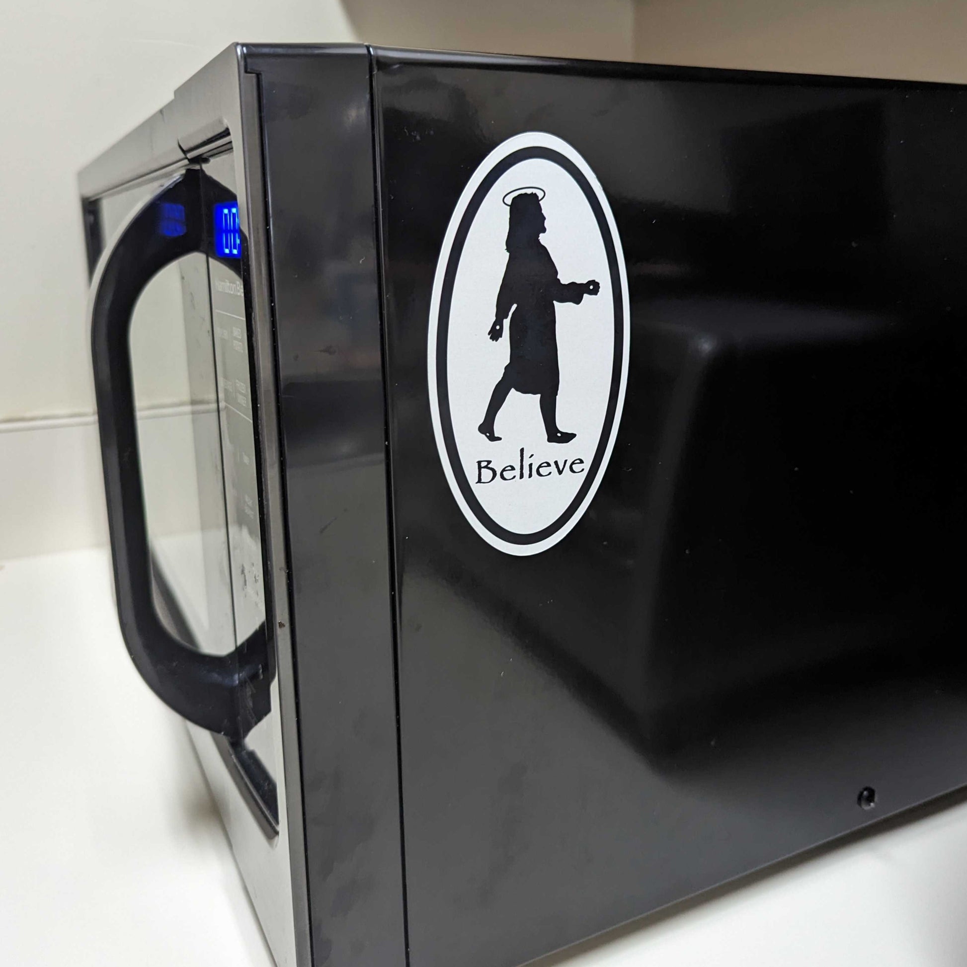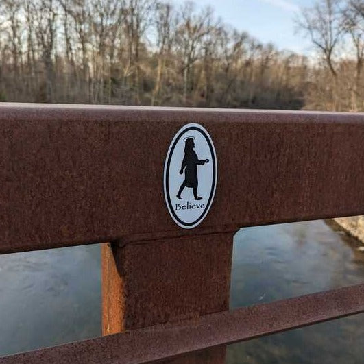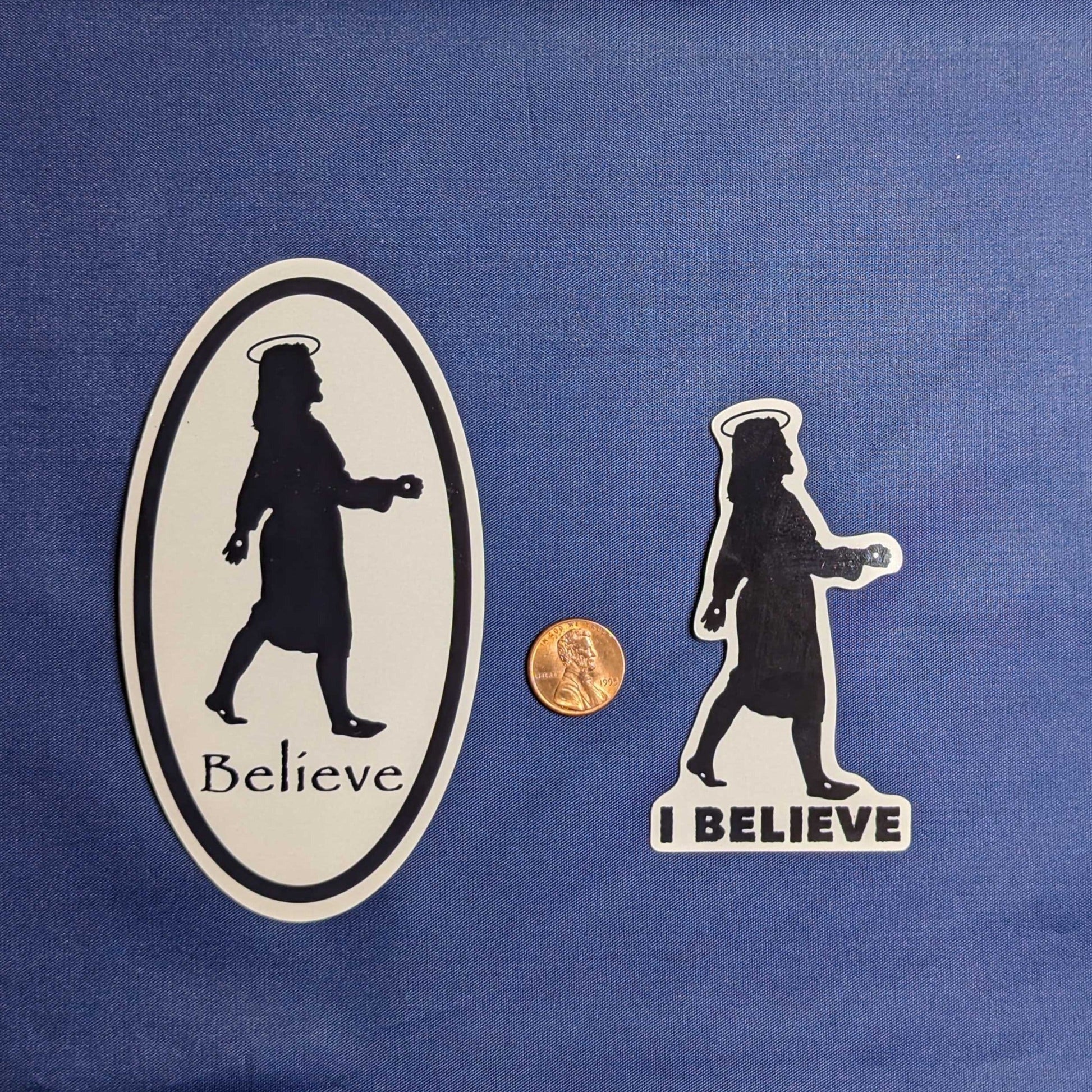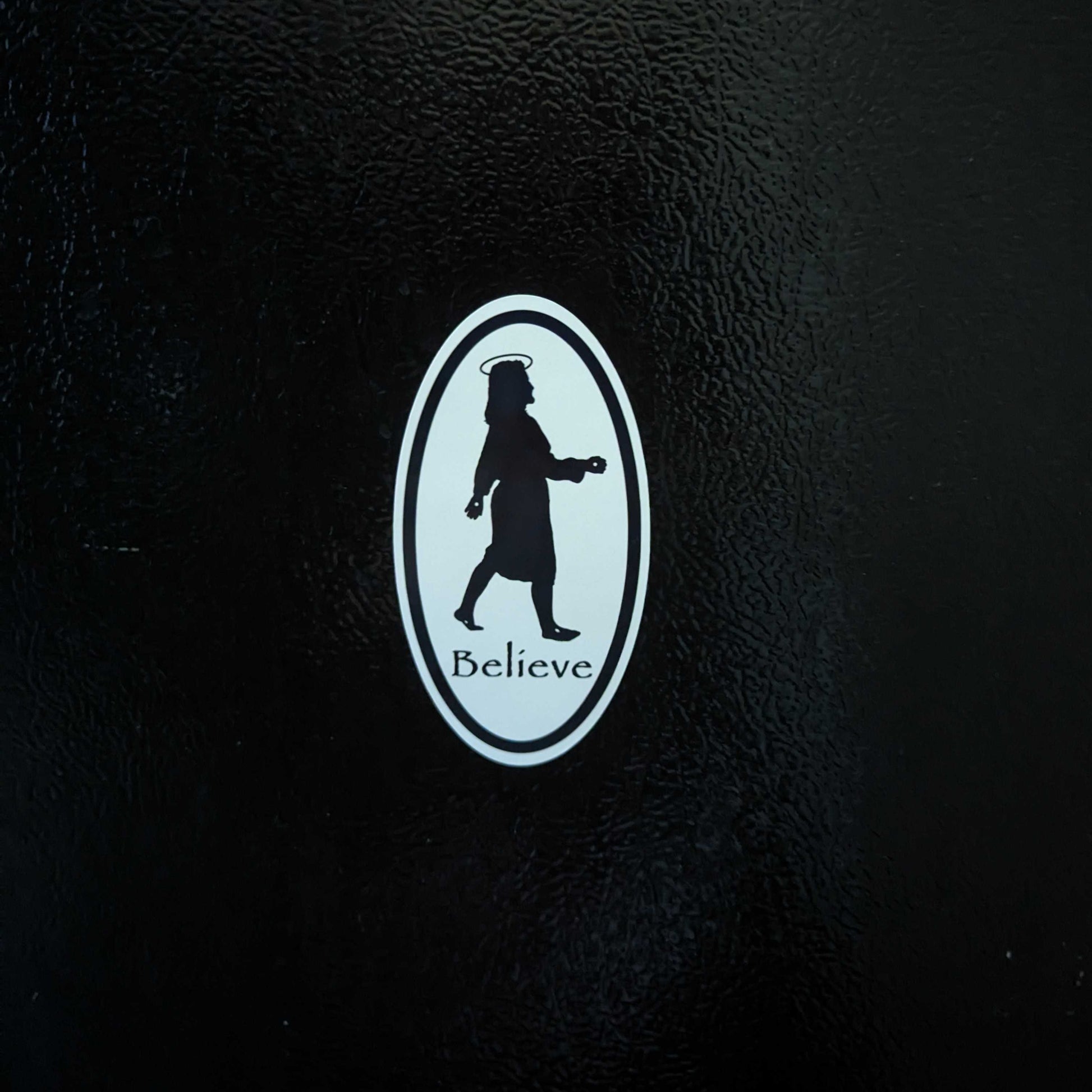 This oval magnet of Jesus ‘Believe’ shares the true message of our savior, Jesus Christ, who died for our sins and was raised three days later. An adaptation of the Bigfoot folklore, our rendition of Jesus shows Him proudly walking three days after He was risen from the grave, with a halo over his head and subtle piercing marks on his hands and feet.