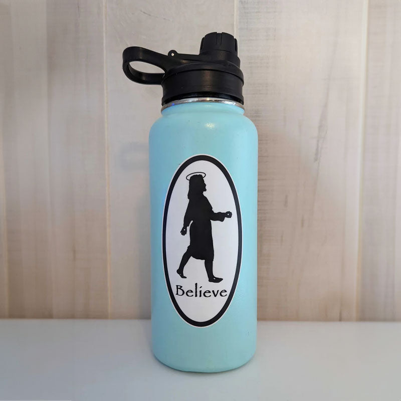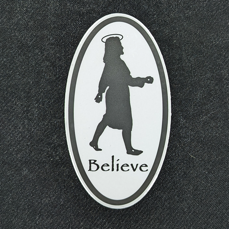 This oval sticker of Jesus ‘Believe’ shares the true message of our savior, Jesus Christ, who died for our sins and was raised three days later. An adaptation of the Bigfoot folklore, our rendition of Jesus shows Him proudly walking three days after He was risen from the grave, with a halo over his head and subtle piercing marks on his hands and feet.