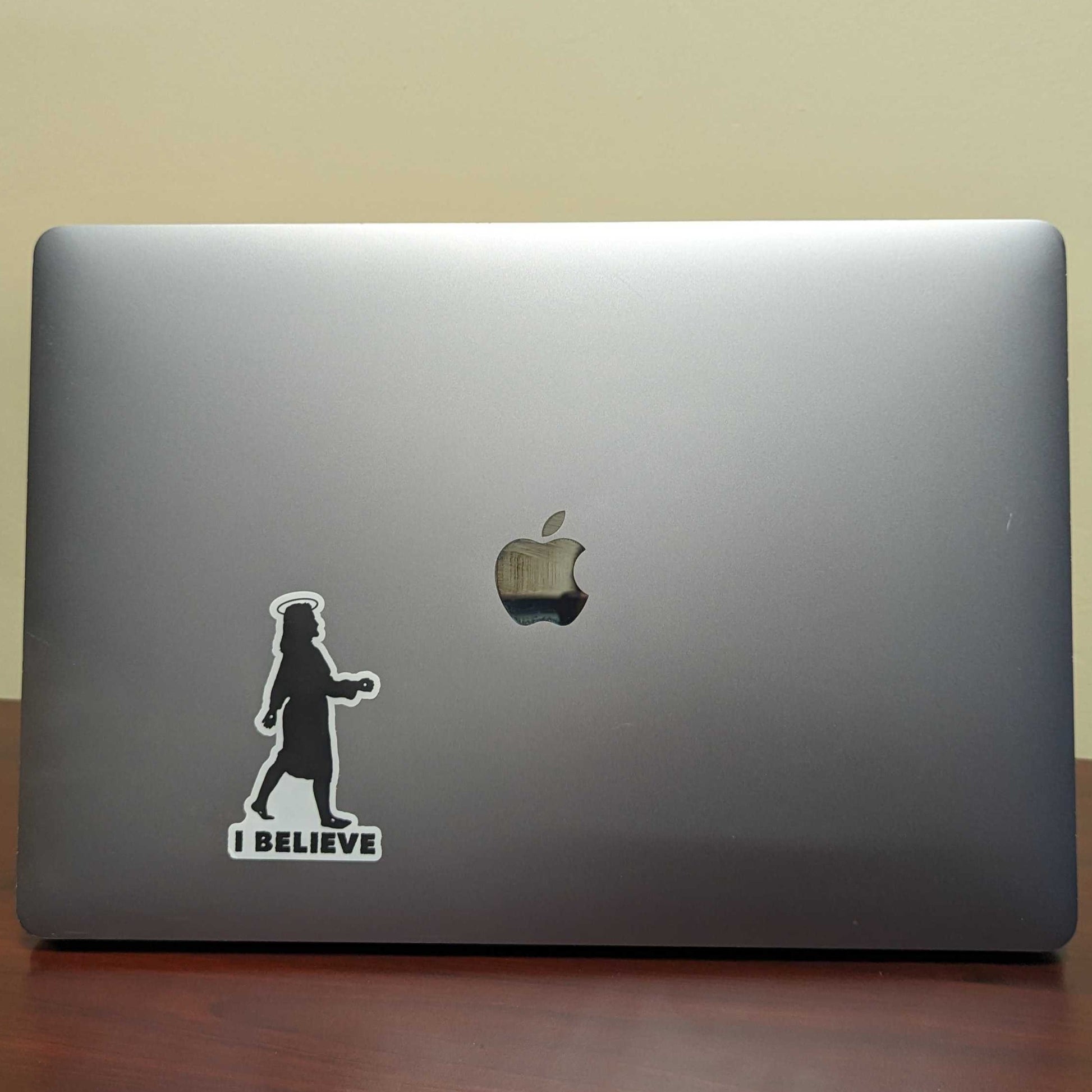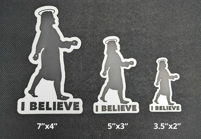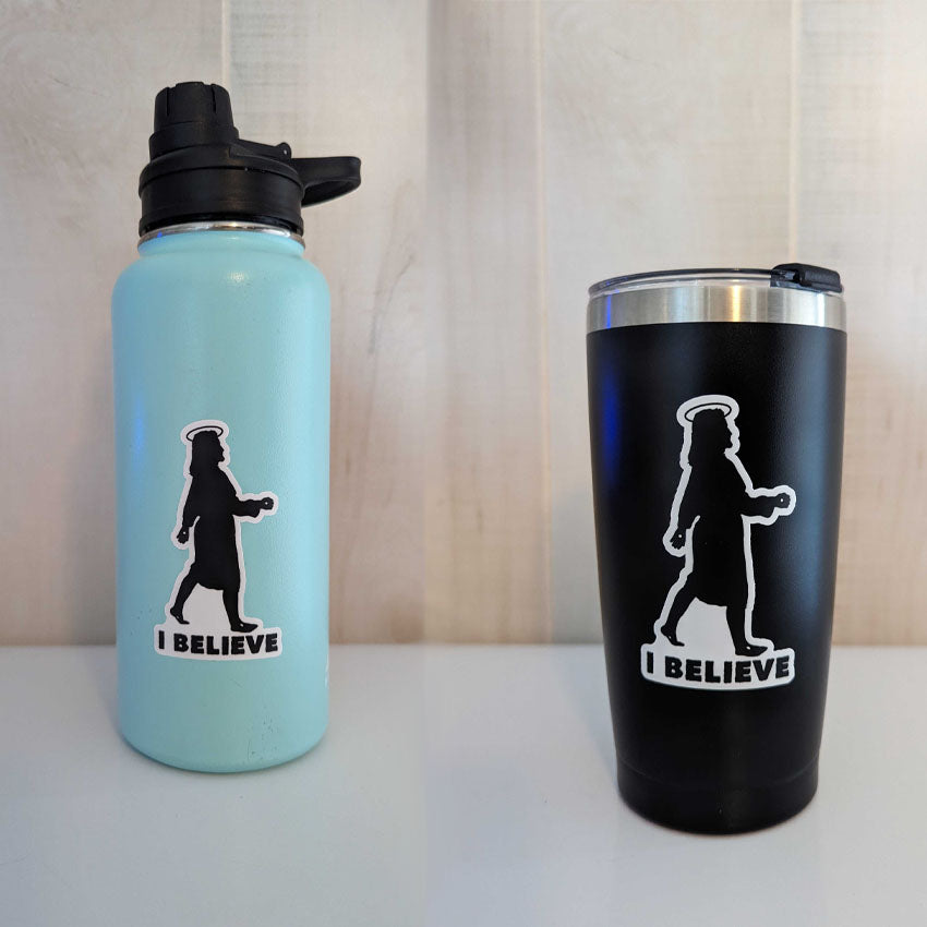 This custom die-cut sticker of Jesus ‘I BELIEVE’ shares the true message of our savior, Jesus Christ, who died for our sins and was raised three days later. An adaptation of the Bigfoot folklore, our rendition of Jesus shows Him proudly walking three days after He was risen from the grave, with a halo over his head and subtle piercing marks on his hands and feet.