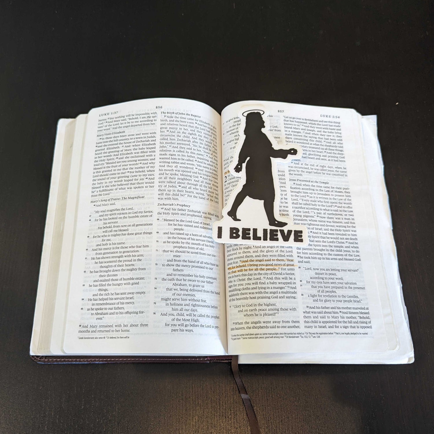 'I BELIEVE' in Jesus is an adaptation of the Bigfoot folklore, portraying Jesus proudly walking three days after He was risen from the grave. This rendition features Him with a halo over His head and subtle piercing marks on His hands and feet. Let the world know where your heart lies with this powerful statement of faith. 'Believe' in Jesus serves as a daily reminder of our need for unwavering faith. Place these reminders nearly anywhere to help keep your focus on Christ.